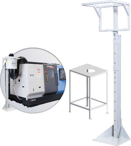 Diese vielseitigen Ständer sind so ausgelegt, dass sie direkt auf die Werkzeugmaschine passen, wenn die Bodenfläche knapp ist. Sie ermöglichen die Montage der Geräte unter Berücksichtigung von Einsatzort, Anwendung, Zugang für laufende Wartungsarbeiten und Größe der Einheit. Werkzeugmaschinenständer sind für Geräte der S-Serie und FX-Serie erhältlich.
